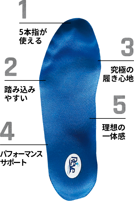 Even if you think your shoes are the right size, there is still 5mm or more of extra space in the front and back, which causes loss of direct feeling, unnecessary movement, pain from friction, and fatigue. Five-Finger Insoles stabilizes the position of the foot in the shoe by shaping the sole of the foot to its own shape, so there is a great possibility that it can solve these problems.